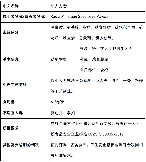 本次申報(bào)的新食品原料牛大力粉的使用范圍為單獨(dú)食用,或者添加到各類食品中使用。牛大力作為一種健康滋補(bǔ)食材,具有強(qiáng)筋壯骨、抗疲勞、無(wú)毒無(wú)副作用的特點(diǎn),攝入人群無(wú)明確的限制。根據(jù)對(duì)牛大力進(jìn)行的一系列安全性考察,在最大食用劑量為8.0g/天時(shí)是安全的。所以在此次申請(qǐng)中我們推薦為牛大力粉食用量為每日≤8g。