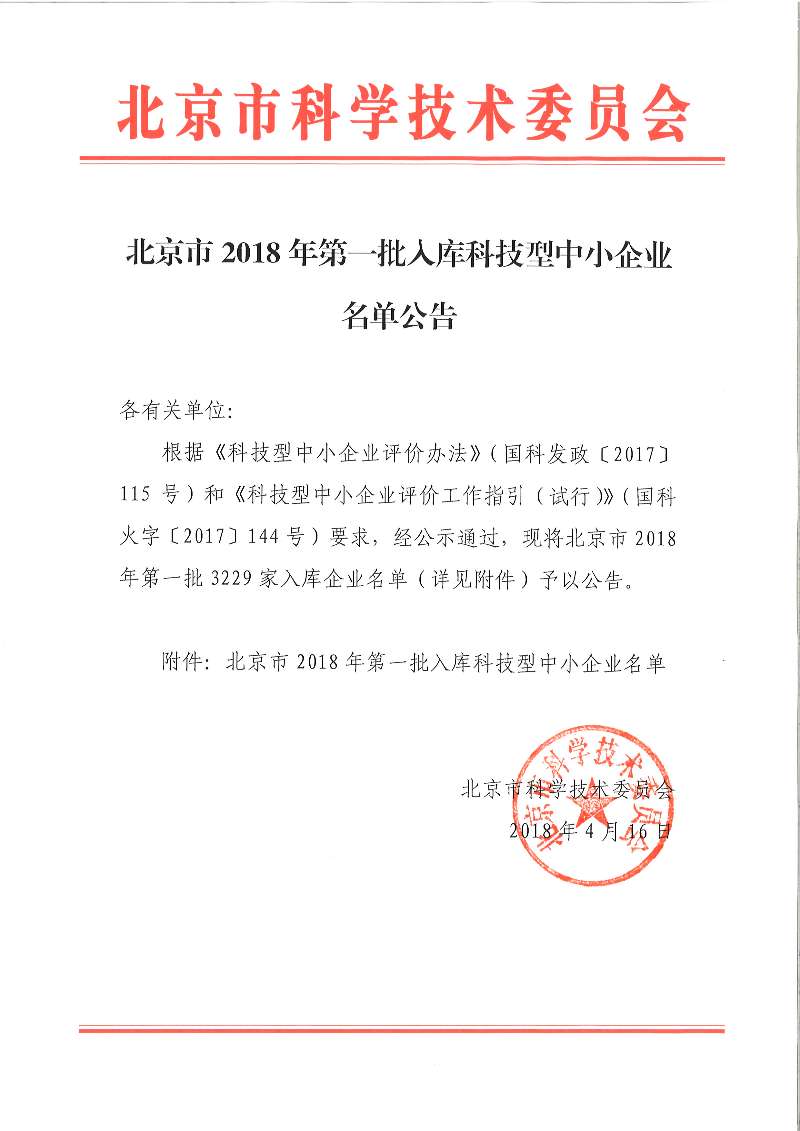 近日,北京市科委根據(jù)《科技型中小企業(yè)評價辦法》(國科發(fā)政〔2017〕115號)和《科技型中小企業(yè)評價辦法指引(試行)》(國科火字〔2017〕114號)要求,公示通過北京市2018年第一批 “科技型中小企業(yè)”,我公司成功入庫北京市2018年第一批全國科技型中小企業(yè)!。這是我公司研究開發(fā)服務(wù)取得的又一喜人成果,是我公司走科技型企業(yè)發(fā)展的一個巨大突破,是有關(guān)政府部門對我司研發(fā)和技術(shù)服務(wù)能力的認可。