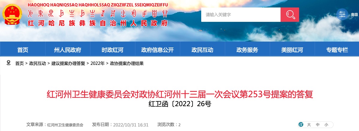 紅河州衛(wèi)生健康委員會(huì)對(duì)政協(xié)紅河州十三屆一次會(huì)議第253號(hào)提案的答復(fù)