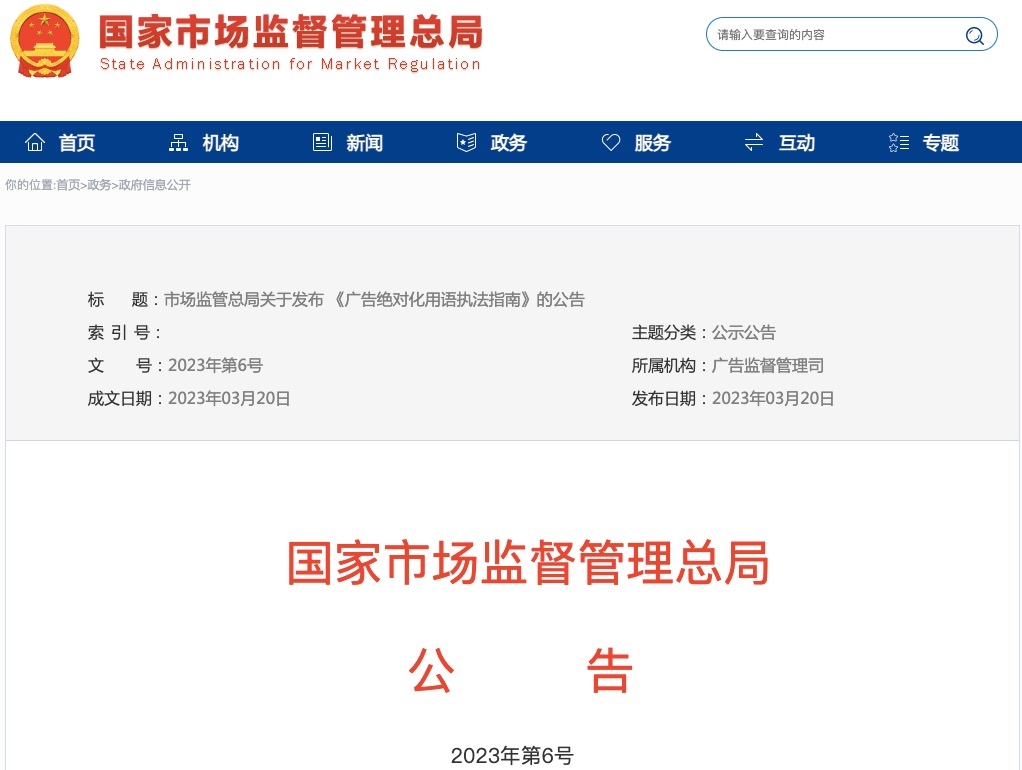為進一步規(guī)范廣告絕對化用語執(zhí)法,保護自然人、法人和其他組織的合法權(quán)益,維護廣告市場秩序,市場監(jiān)管總局于近日發(fā)布《廣告絕對化用語執(zhí)法指南》(以下簡稱《指南》),為市場監(jiān)管部門開展廣告絕對化用語監(jiān)管執(zhí)法提供指引。