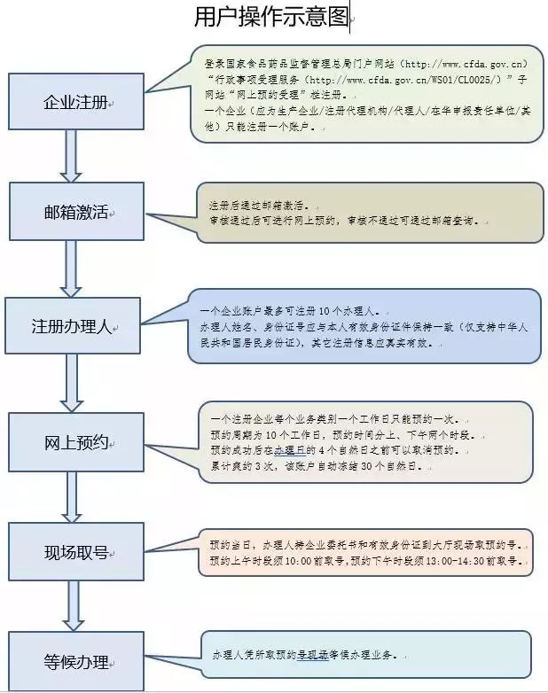 三、注冊(cè)方式。2017年7月20日起,申請(qǐng)人可登陸國(guó)家食品藥品監(jiān)督管理總局門(mén)戶(hù)網(wǎng)站“行政事項(xiàng)受理服務(wù)”子網(wǎng)站(http://www.cfda.gov.cn/WS01/CL0025/ )提前注冊(cè)(詳見(jiàn)用戶(hù)操作示意圖)。注冊(cè)審核通過(guò)后,企業(yè)方可辦理網(wǎng)上預(yù)約業(yè)務(wù)。
