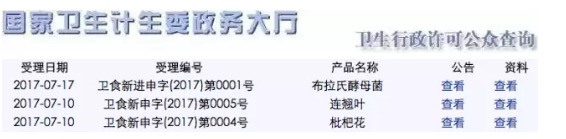 2017年07月20日,國家衛(wèi)計委新食品原料受理系統(tǒng)又有最新動態(tài)。此次受理的新食品原料為枇杷花、連翹葉、布拉氏酵母菌,受理編號依次為:衛(wèi)食新申字(2017)第0004號、衛(wèi)食新申字(2017)第0005號、衛(wèi)食新進(jìn)申字(2017)第0001號,擬公告內(nèi)容: