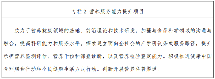 2.創(chuàng)新營養(yǎng)健康服務(wù),引導(dǎo)營養(yǎng)健康產(chǎn)業(yè)發(fā)展。以提高營養(yǎng)健康產(chǎn)品研發(fā)能力為目標,支持地方建設(shè)營養(yǎng)創(chuàng)新平臺和營養(yǎng)重點實驗室,探索建立面向全社會的產(chǎn)學(xué)研鏈條式服 務(wù)路徑,解析不同人群特殊營養(yǎng)需求,有針對性地推動食品研發(fā)創(chuàng)新,持續(xù)提升產(chǎn)品健康內(nèi)涵。加大力度創(chuàng)新加工技術(shù)工藝,加快促進食品加工營養(yǎng)化轉(zhuǎn)型。提升營養(yǎng)監(jiān)測評估、營養(yǎng)干預(yù)和篩查診斷以及營養(yǎng)檢驗鑒定能力,逐步構(gòu)建形成我國營養(yǎng)評價技術(shù)與監(jiān)測網(wǎng)絡(luò)體系。推進體醫(yī)融合發(fā)展,加強產(chǎn)業(yè)指導(dǎo),規(guī)范市場秩序,促進生產(chǎn)、消費、營養(yǎng)、健康綠色協(xié)調(diào)發(fā)展,構(gòu)建以預(yù)防為主、防治結(jié)合的營養(yǎng)運動健康管理模式。創(chuàng)新營養(yǎng)科普信息表達形式,針對性拓展傳播渠道,建立免費共享的營養(yǎng)科普平臺,定向、精準地將科普信息普及到全民。