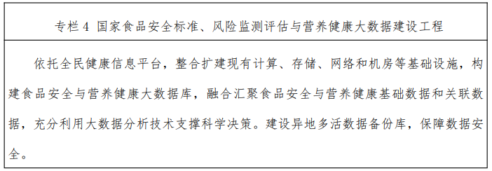 3.發(fā)揮數(shù)字技術(shù)引領(lǐng)創(chuàng)新作用,統(tǒng)籌推進食品安全標準與監(jiān)測評估、營養(yǎng)健康管理信息化建設(shè)。依托全民健康信息平臺,構(gòu)建食品安全與營養(yǎng)健康大數(shù)據(jù)庫。建設(shè)國家食品安 全與營養(yǎng)健康大數(shù)據(jù)平臺,融合匯聚食品安全與營養(yǎng)健康基礎(chǔ)數(shù)據(jù)和關(guān)聯(lián)數(shù)據(jù),充分利用大數(shù)據(jù)分析技術(shù)支撐科學(xué)決策。積極推動大數(shù)據(jù)、人工智能、區(qū)塊鏈等數(shù)字技術(shù)與食品安全與營養(yǎng)健康深度融合的關(guān)鍵技術(shù)研究。建立食品安全與營養(yǎng)健康一體化、協(xié)同化共享互通的信息技術(shù)標準規(guī)范和信息資源目錄。鼓勵各省建設(shè)有自身業(yè)務(wù)特色的食品安全與營養(yǎng)健康信息平臺,積極推進“國家—省”兩級平臺、“國家—省—市—縣”四級網(wǎng)絡(luò)體系建設(shè),健全網(wǎng)絡(luò)和數(shù)據(jù)安全防護體系。