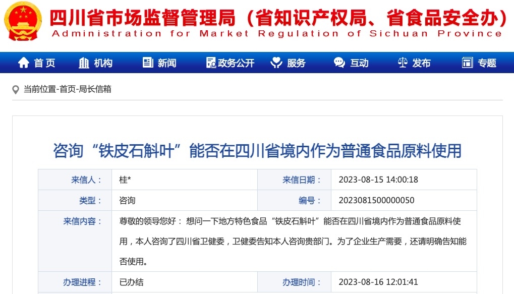 2021年,《四川省開展天麻、鐵皮石斛、靈芝按照傳統(tǒng)既是食品又是中藥材的物質(zhì)管理試點方案》經(jīng)省政府同意,并報國家衛(wèi)生健康委、國家市場監(jiān)管總局核定,決定在四川省內(nèi)開展為期一年的天麻、鐵皮石斛、靈芝三種物質(zhì)按照傳統(tǒng)既是食品又是中藥材的物質(zhì)管理試點工作。產(chǎn)品范圍:在全省行政區(qū)域內(nèi)(包括省外種植基地)種植以天麻、鐵皮石斛、靈芝為原材料,按照傳統(tǒng)生產(chǎn)工藝或飲食習(xí)慣食用加工的普通食品,不包括化學(xué)提取物產(chǎn)品(如含某種物質(zhì)提取素的藥品、保健食品)。試點產(chǎn)品須按“食品生產(chǎn)許可分類目錄”取得相關(guān)品種生產(chǎn)許可后方可從事生產(chǎn)加工。目前試點工作已結(jié)束。經(jīng)查詢,鐵皮石斛葉已終止審查,衛(wèi)生行政部門建議按照《食品安全法》第29條管理。