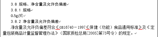 備案申請(qǐng)人應(yīng)按照《保?。üδ埽┦称吠ㄓ脴?biāo)準(zhǔn)》(GB 16740-1997)及《定量包裝商品計(jì)量監(jiān)督管理辦法》(國(guó)家質(zhì)檢總局[2005]第75號(hào)令)的規(guī)定,標(biāo)示產(chǎn)品的規(guī)格,并規(guī)定產(chǎn)品凈含量及允許負(fù)偏差,凈含量的單位可標(biāo)示為g/盒、mL/盒、g/袋等。