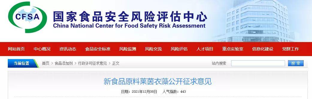 受國(guó)家衛(wèi)生健康委員會(huì)委托,根據(jù)《食品安全法》和《新食品原料安全性審查管理辦法》的規(guī)定,萊茵衣藻申報(bào)新食品原料已通過專家評(píng)審委員會(huì)技術(shù)審查,現(xiàn)公開征求意見,請(qǐng)于2022年1月8日前將意見反饋至我中心,逾期將不予處理。
