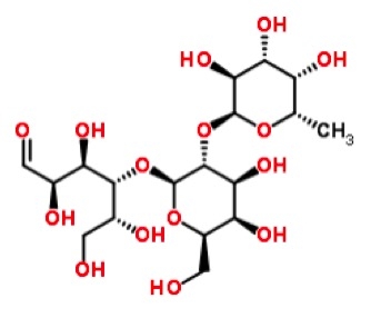 2'-巖藻糖基乳糖英文名稱2′-fucosyllactose,簡稱2'-FL,分子量為488.44,CAS號是41263-94-9,化學式為C18H32O15,生產(chǎn)方式包括化學法、酶法和微生物發(fā)酵法。2'-FL是人類母乳中含量最豐富的一種低聚糖,約占30%,同時存在于豬、牛等動物乳汁中。2'-FL是由乳糖與L-巖藻糖組成的非還原性三糖,其還原性末端連接一個乳糖,非還原端的巖藻糖通過α-1,2-鍵與乳糖結構中的半乳糖連接,分子結構如下圖所示: