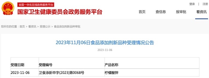 食品添加劑新品種 | 國家衛(wèi)健委發(fā)布檸檬酸鉀受理公告
