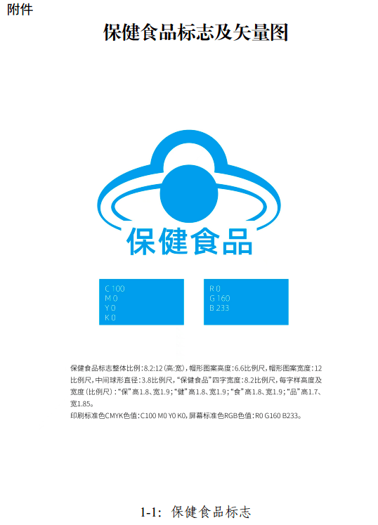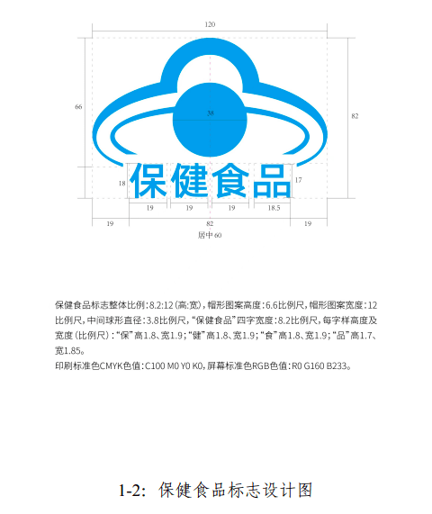 六、保健食品標(biāo)志印刷標(biāo)準(zhǔn)色CMYK色值為 C100 M0 Y0K0,屏幕標(biāo)準(zhǔn)色RGB色值:R0 G160 B233。