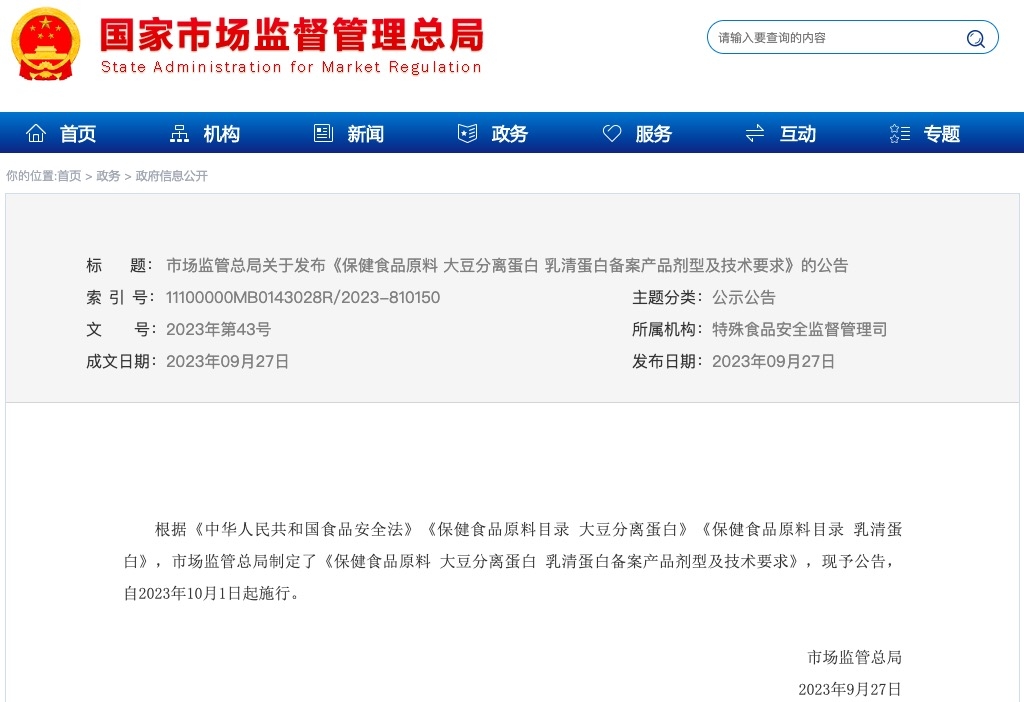 根據(jù)《中華人民共和國食品安全法》《保健食品原料目錄 大豆分離蛋白》《保健食品原料目錄 乳清蛋白》,市場監(jiān)管總局制定了《保健食品原料 大豆分離蛋白 乳清蛋白備案產(chǎn)品劑型及技術(shù)要求》,現(xiàn)予公告,自2023年10月1日起施行。