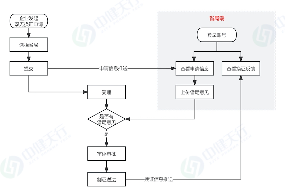 對于國產(chǎn)“雙無”產(chǎn)品,注冊申請人應(yīng)提前向核發(fā)生產(chǎn)許可的省局申請《出具換證意見》,待取得省局意見后,再在系統(tǒng)中發(fā)起“雙無”換證申請。但是由于不同省局出具換證意見的工作方案存在差異,申請人需提前了解當(dāng)?shù)鼐唧w要求,具體可參考以下流程: