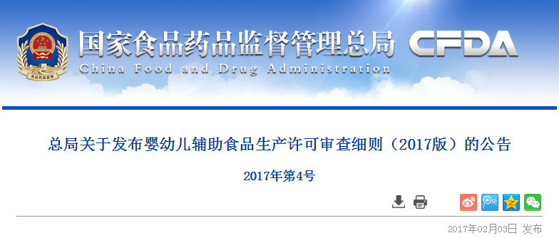 為做好嬰幼兒輔助食品生產(chǎn)許可審查工作,規(guī)范嬰幼兒輔助食品生產(chǎn)加工活動,根據(jù)《中華人民共和國食品安全法》及其實施條例、《食品生產(chǎn)許可管理辦法》(國家食品藥品監(jiān)督管理總局令第16號)等有關(guān)規(guī)定,國家食品藥品監(jiān)督管理總局組織制定了《嬰幼兒輔助食品生產(chǎn)許可審查細則》(2017版),現(xiàn)予發(fā)布,自發(fā)布之日起施行。