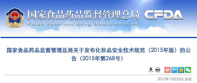 國家食品藥品監(jiān)督管理總局關(guān)于發(fā)布化妝品安全技術(shù)規(guī)范(2015年版)的公告(2015年第268號)