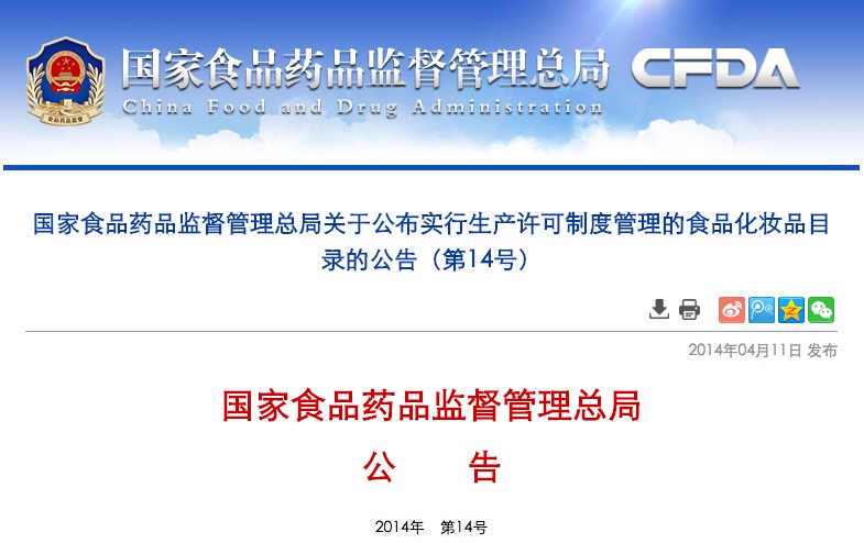 國家食品藥品監(jiān)督管理總局關(guān)于公布實(shí)行生產(chǎn)許可制度管理的食品化妝品目錄的公告(第14號)