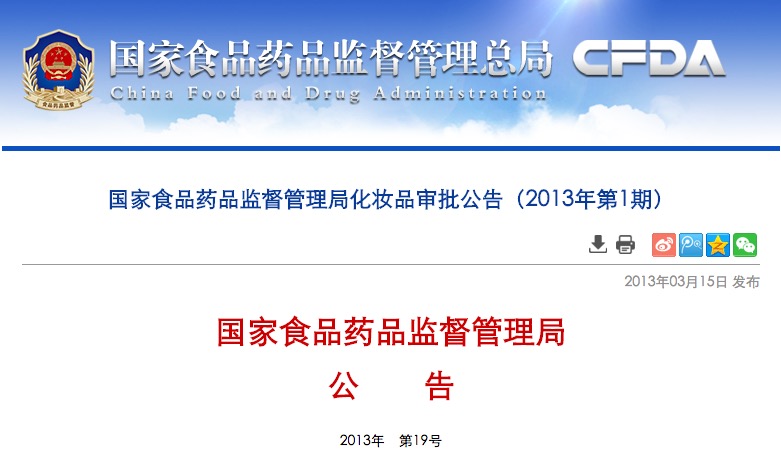 國家食品藥品監(jiān)督管理局化妝品審批公告(2013年第1期)