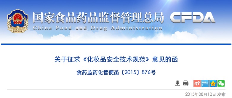 為進(jìn)一步完善化妝品安全技術(shù)法規(guī)體系,結(jié)合我國(guó)化妝品行業(yè)發(fā)展和監(jiān)管實(shí)際,我司組織對(duì)《化妝品衛(wèi)生規(guī)范》(2007年版)進(jìn)行修訂,形成了《化妝品安全技術(shù)規(guī)范》(征求意見稿)?,F(xiàn)公開征求意見,請(qǐng)于2015年9月1日前將有關(guān)意見以電子郵件形式反饋化妝品標(biāo)委會(huì)秘書處(電子郵箱:hzpbwh@nifdc.org.cn)。