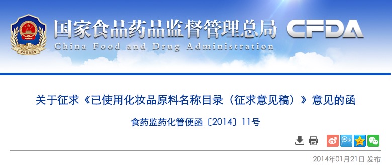 為進一步加強化妝品原料管理,在原國家食品藥品監(jiān)督管理局發(fā)布的第一批、第二批《已批準使用的化妝品原料名稱目錄》的基礎上,我司對已使用的化妝品原料目錄作了進一步梳理工作,形成了《已使用化妝品原料名稱目錄(征求意見稿)》?,F(xiàn)公開征求意見,請于2014年2月20日前將意見和建議以電子郵件形式反饋我司。