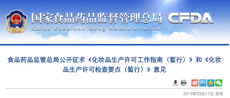 為進(jìn)一步加強化妝品生產(chǎn)監(jiān)管,保障化妝品質(zhì)量安全,按照《國務(wù)院辦公廳關(guān)于印發(fā)國家食品藥品監(jiān)督管理總局主要職責(zé)內(nèi)設(shè)機構(gòu)和人員編制規(guī)定的通知》(國辦發(fā)〔2013〕24號)和《國家食品藥品監(jiān)督管理總局關(guān)于公布實行生產(chǎn)許可制度管理的食品化妝品目錄的公告》(2014年第14號)的相關(guān)要求,依據(jù)化妝品監(jiān)督管理有關(guān)法規(guī),國家食品藥品監(jiān)督管理總局經(jīng)過深入調(diào)研論證,并根據(jù)各方面意見和建議修改完善,形成了《化妝品生產(chǎn)許可工作指南(暫行)》和《化妝品生產(chǎn)許可檢查要點(暫行)》,現(xiàn)向社會公開征求意見。