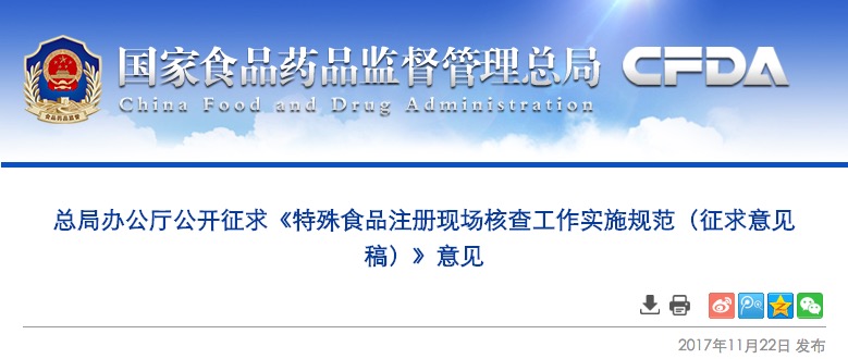 總局辦公廳公開(kāi)征求《特殊食品注冊(cè)現(xiàn)場(chǎng)核查工作實(shí)施規(guī)范(征求意見(jiàn)稿)》意見(jiàn)