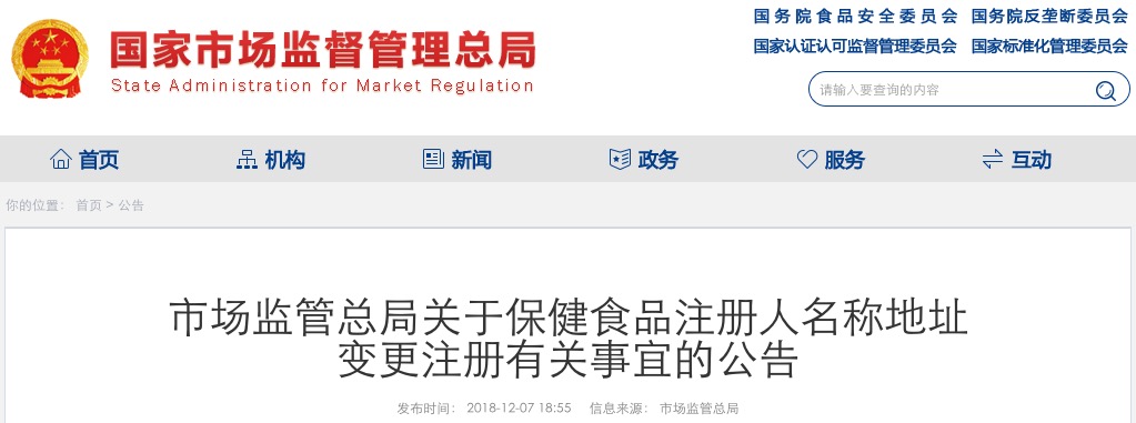 市場(chǎng)監(jiān)管總局關(guān)于保健食品注冊(cè)人名稱地址變更注冊(cè)有關(guān)事宜的公告