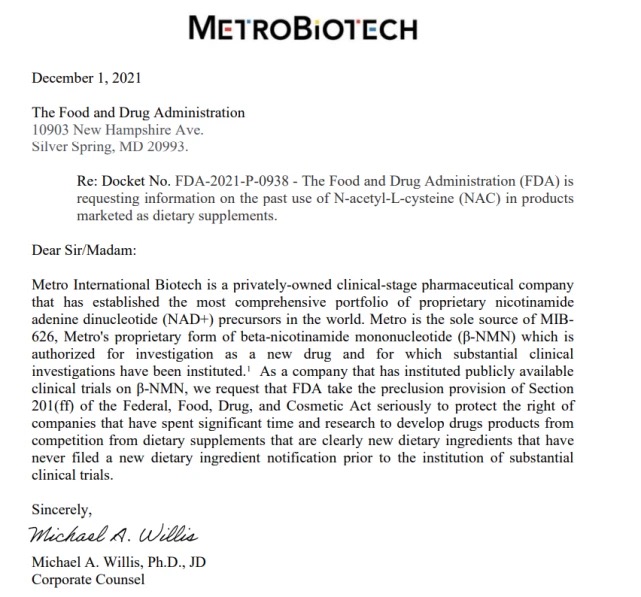 2021年12月1日,制藥公司MetroBiotech就給美國FDA寫信,大致內(nèi)容是公司獨立研發(fā)的MIB-626是一種“NMN衍生分子”,已經(jīng)被授權(quán)作為新型藥物進入了臨床階段,希望FDA認真對待聯(lián)邦食品、藥品和化妝品法第201(ff)條的排除條款,下架作為膳食補充劑上市但卻沒申請新NDI的NMN產(chǎn)品,從而保護那些花費時間和資源在開發(fā)藥品的公司權(quán)利。