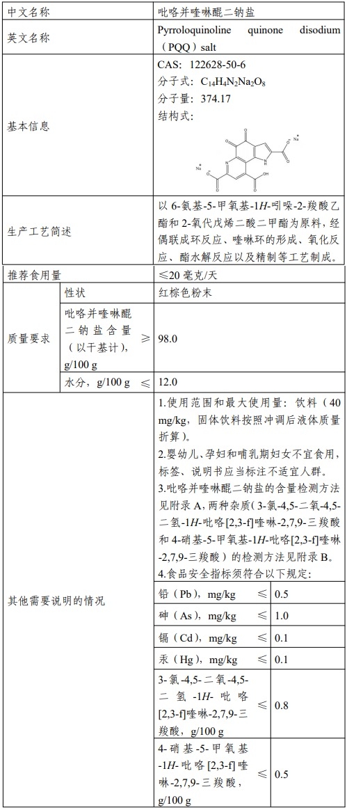 2023年2月2日,國(guó)家衛(wèi)健委發(fā)布吡咯喹啉醌二鈉鹽(PQQ)受理公告,受理編號(hào):衛(wèi)食新申字(2023)第0001號(hào),這是2023年第一個(gè)被受理的新食品原料,此前,PQQ在2022年3月于國(guó)家衛(wèi)健委2022年第1號(hào)公告中已經(jīng)被批準(zhǔn)為新食品原料,其生產(chǎn)工藝是化學(xué)合成法,可應(yīng)用于飲料領(lǐng)域。