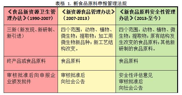 中國(guó)對(duì)于新食品原料的管理相比于歐美發(fā)達(dá)國(guó)家地區(qū)相對(duì)較晚,但是正在一步步地趨于成熟,總體而言有三個(gè)階段(表格 1)。