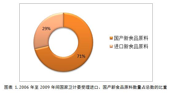 通過對(duì)國(guó)家衛(wèi)生計(jì)生委衛(wèi)生行政許可公眾查詢數(shù)據(jù)庫(kù)的信息檢索分析后,筆者發(fā)現(xiàn)2009年至2016年共七年間,截至2016年10月28日,國(guó)家衛(wèi)計(jì)委共公開受理新食品原料申報(bào)251件,其中29%申報(bào)的新食品原料為進(jìn)口,71%的為國(guó)產(chǎn) (圖表 1)。絕大多數(shù)申報(bào)的新食品原料為中國(guó)本土資源,側(cè)面體現(xiàn)了我國(guó)有豐富的資源值得食品行業(yè)開發(fā)和利用。