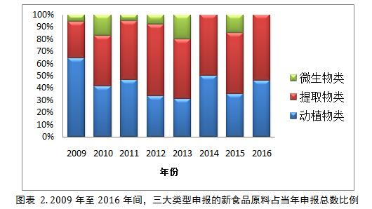 所有申報(bào)的新食品原料可分為三大類:動(dòng)植物類,微生物類和提取物類。下表反映了各年中這三大類申報(bào)的新食品原料數(shù)量的差異以及整體的趨勢(shì)。