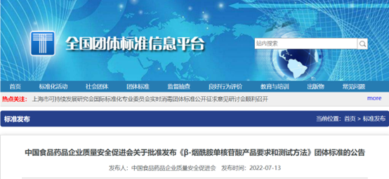 2022年7月13日,中國食品藥品企業(yè)質(zhì)量安全促進(jìn)會發(fā)布β-煙酰胺單核苷酸(NMN)產(chǎn)品要求和測試方法團(tuán)體標(biāo)準(zhǔn),適用于進(jìn)出口原料β-煙酰胺單核苷酸產(chǎn)品的質(zhì)量控制,將于2022年8月12日正式實施。這是國內(nèi)首個NMN產(chǎn)品標(biāo)準(zhǔn)正式公布,填補(bǔ)了國內(nèi)空白。