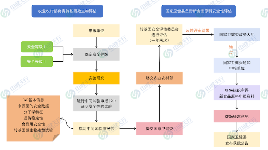 新食品原料申報部分按照《食品安全法》、《新食品原料安全性審查管理辦法》、《新資源食品原料申報與受理規(guī)定》等;目前農(nóng)業(yè)農(nóng)村部沒有發(fā)布食品用轉(zhuǎn)基因微生物安全性評估指南,轉(zhuǎn)基因微生物安全評估申報部分主要參考《動物用轉(zhuǎn)基因微生物安全評價指南》中有關(guān)“中間試驗”申報書的要求,組織撰寫完整內(nèi)容的申報書。申請人按照上述規(guī)定準備申報材料,向國家衛(wèi)生健康委員會提出受理申請,首先由農(nóng)業(yè)農(nóng)村部評價轉(zhuǎn)基因菌種的安全性,然后由國家衛(wèi)生健康委員會評價新食品原料的安全性。具體申報流程如下: